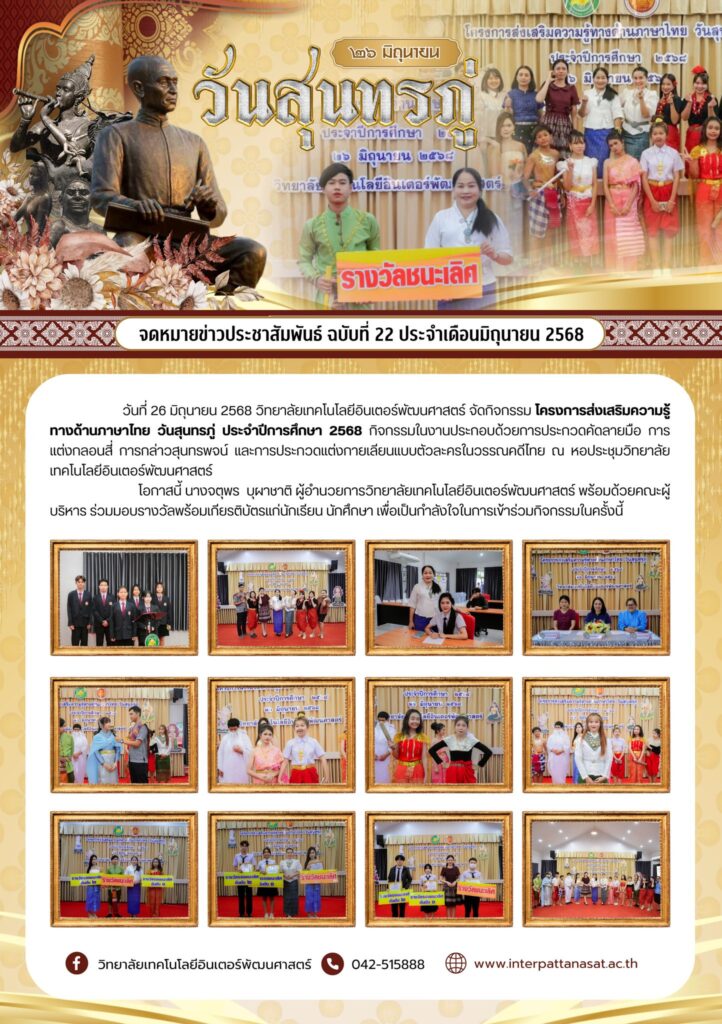 จดหมายข่าวประชาสัมพันธ์ ฉบับที่ 22/2568 วันที่ 26 มิถุนายน 2568 วิทยาลัยเทคโนโลยีอินเตอร์พัฒนศาสตร์ จัดกิจกรรมโครงการส่งเสริมความรู้ทางด้านภาษาไทย วันสุนทรภู่ ประจำปีการศึกษา 2568