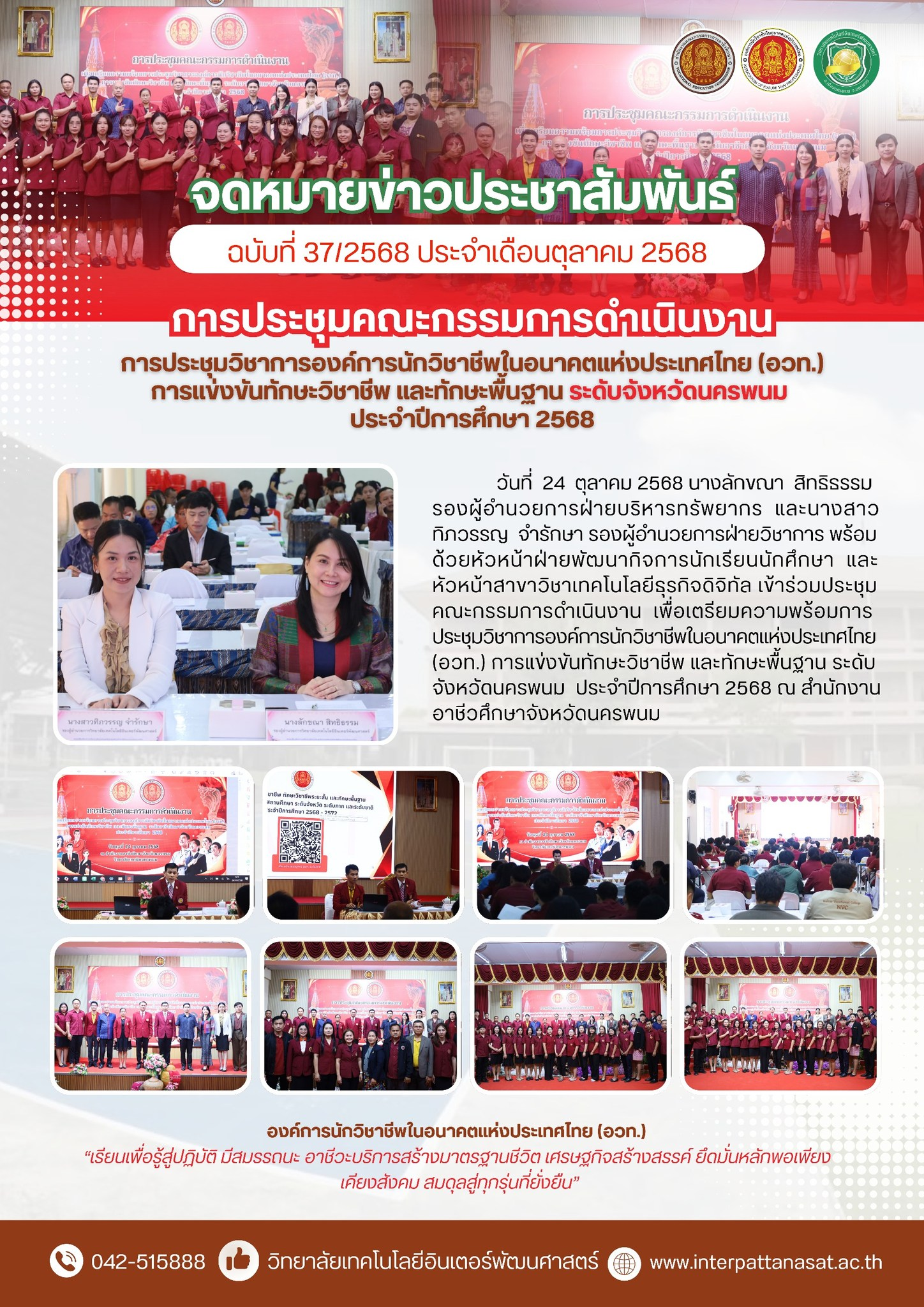 จดหมายข่าวประชาสัมพันธ์ ฉบับที่ 37/2568 ประจำเดือนตุลาคม 2568 การประชุมคณะกรรมการดำเนินงานการประชุมวิชาการองค์การนักวิชาชีพในอนาคตแห่งประเทศไทย (อวท.) การแข่งขันทักษะวิชาชีพและทักษะพื้นฐาน ระดับจังหวัดนครพนม ประจำปีการศึกษา 2568 ณ สำนักงานอาชีวศึกษาจังหวัดนครพนม