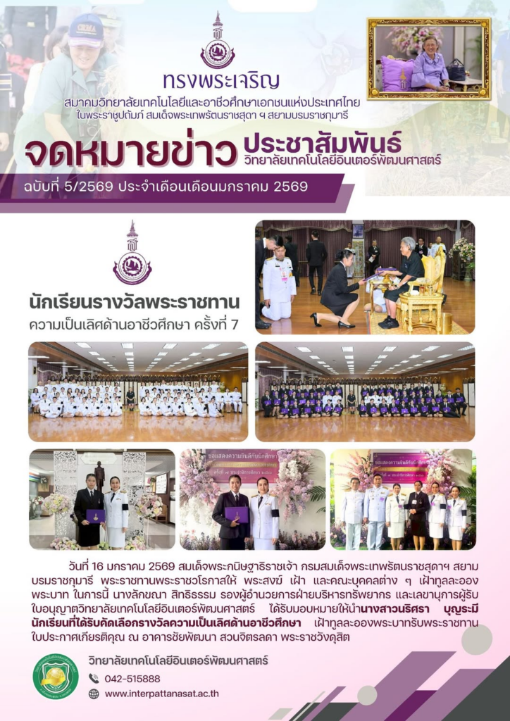 จดหมายข่าวประชาสัมพันธ์ ฉบับที่ 5/2569 ประจำเดือนมกราคม 2569 วิทยาลัยเทคโนโลยีอินเตอร์พัฒนศาสตร์ เฝ้าทูลละอองพระบาทสมเด็จพระกนิษฐาธิราชเจ้า กรมสมเด็จพระเทพรัตนราชสุดาฯ สยามบรมราชกุมารี รับพระราชทานรางวัล “ความเป็นเลิศด้านอาชีวศึกษา ครั้งที่ 7” ณ อาคารชัยพัฒนา สวนจิตรลดา พระราชวังดุสิต